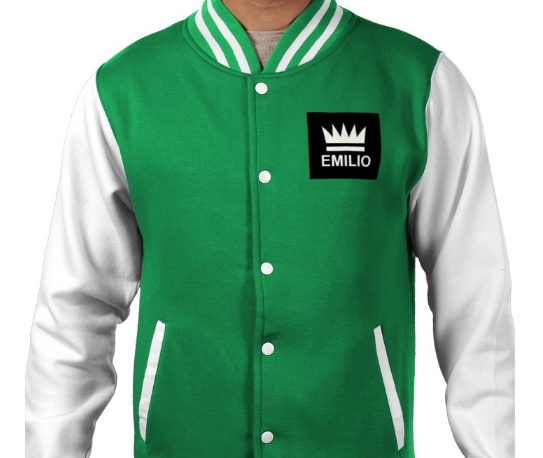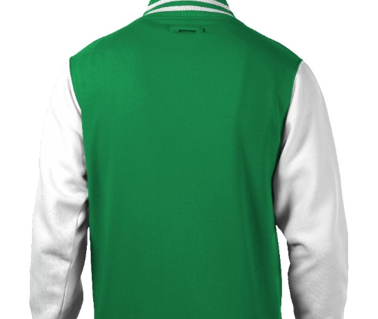 Emilio men's Varsity jacket colour Kelly green white size xx large, 80% Cotton, 20% Polyester press stud closure knitted collar, cuffs and waistband with stripe details contrast sleeves.