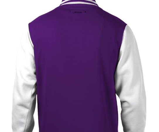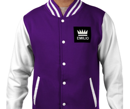 Emilio men's Varsity jacket colour purple white size large, 80% Cotton, 20% Polyester press stud closure knitted collar, cuffs and waistband with stripe details contrast sleeves.
